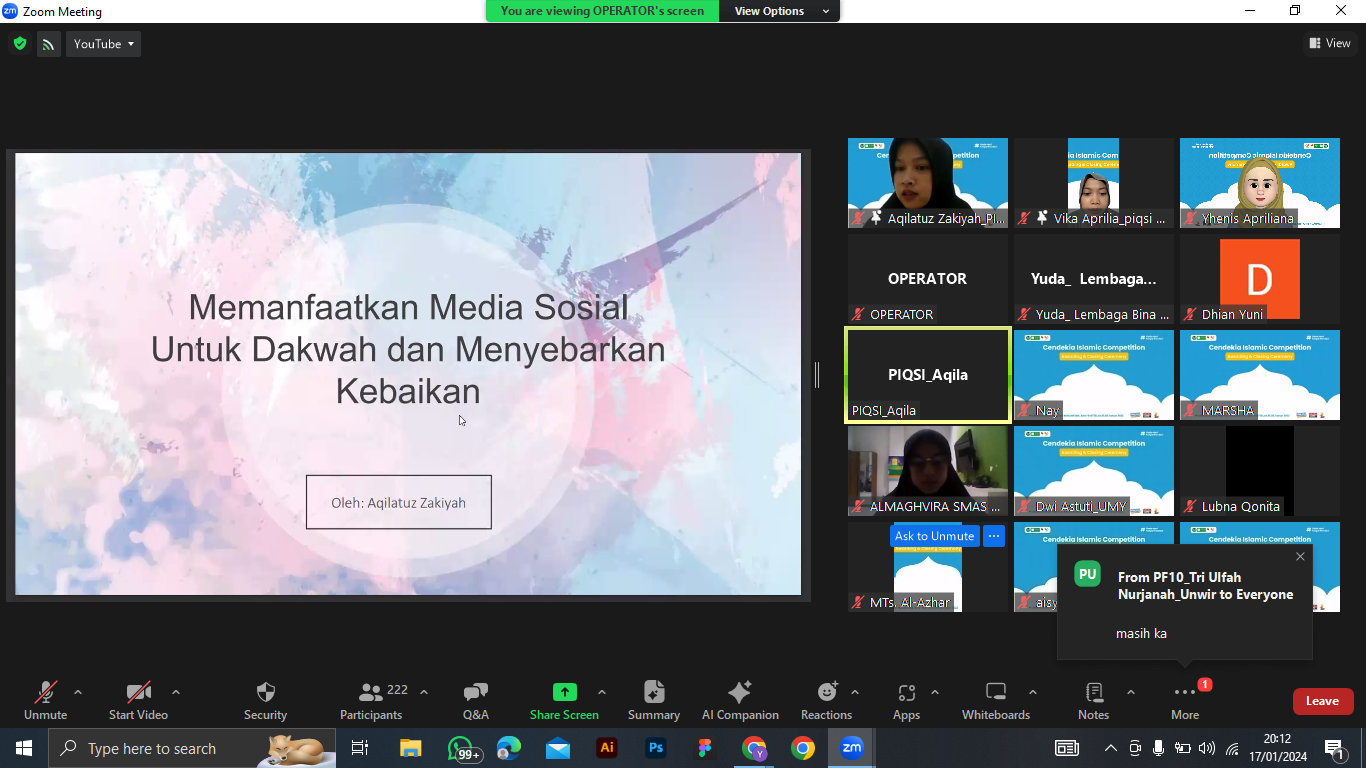 Lembaga Bina Prestasi Nusantara bekerja sama dengan Unit Kegiatan Mahasiswa PIQSI UIN Prof. KH. Saifuddin Zuhri menyelenggarakan Cendekia Islamic Competition. Lebih dari 1100 peserta dari berbagai daerah di Indonesia mengikuti olimpiade ini. Technical meeting membuka rangkaian acara Cendekia Islamic Competition pada tanggal 10 Januari 2024. Peserta melaksanakan olimpiade pada tanggal 12-13 Januari 2024. Webinar menutup Cendekia Islamic pada tanggal 17 Januari 2024. Aqilatuz Zakiyah mahasiswa UIN Prof. KH. Saifuddin Zuhri mengisi webinar dengan materi yang bermanfaat dengan tema “Memanfaatkan Media Sosial untuk Dakwah dan Menyebarkan Kebaikan”.