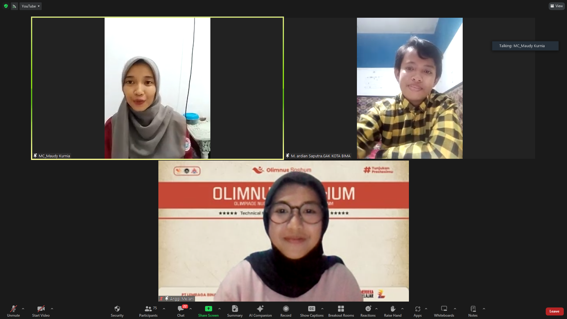 Puncak acara olimpiade ini ditutup dengan webinar yang menghadirkan narasumber ahli Muhammad Khoidir, S.Pd, alumni PPKn Fis-H Universitas Negeri Makassar. Dalam webinar tersebut, Muhammad Khoidir menyampaikan materi dengan tema “Pancasila Membangun Prestasi Generasi Muda”. Beliau memaparkan bagaimana nilai-nilai Pancasila dapat menjadi landasan bagi para pemuda untuk meraih prestasi dan membangun bangsa Indonesia.